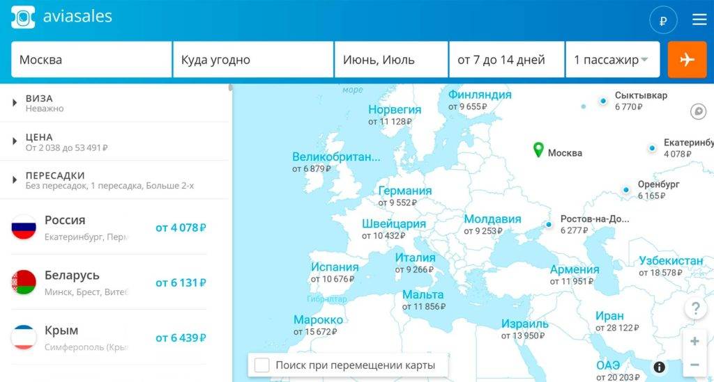 Наглядно можно увидеть уровень цен на полеты из твоего города на карте. Фильтрами можно выставить нужный период, количество ночей и т.д.