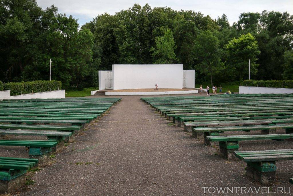 А рядом – летняя эстрада, очевидно, того же времени постройки. В 2020 году в рамках благоустройства прилегающей лесопарковой зоны, эту ламповую эстраду решили демонтировать. На её месте будет возведена новая, крытая, с частичным сохранением архитектуры старой эстрады.