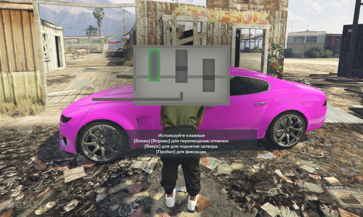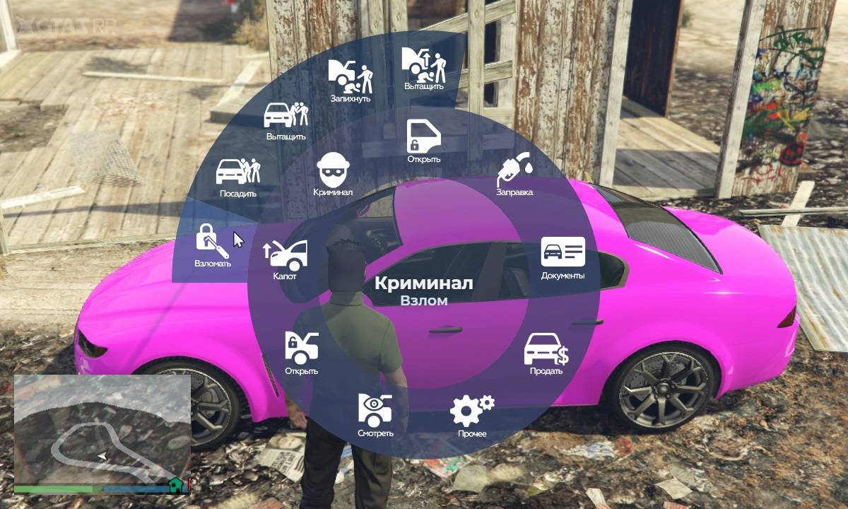 Купив отмычки, едем на место, указанное на карте в виде белого круга, находим нужное авто и через меню «G» выбираем пункт «Криминал › Взломать».