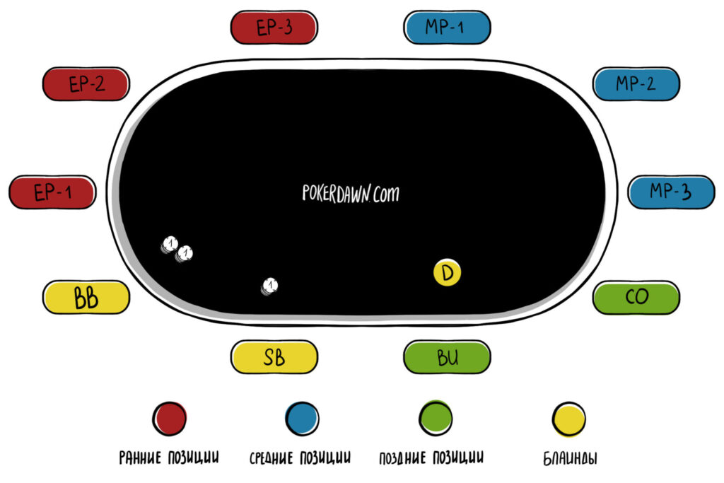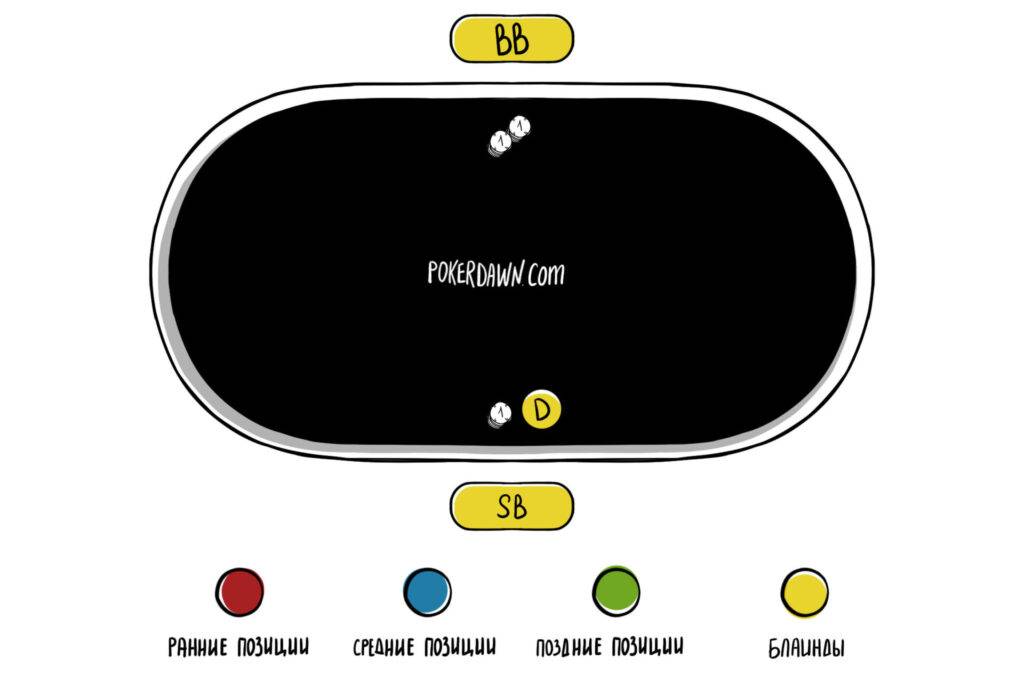- После того как банк разыгран, все позиции (дилер, малый и большой блайнды) смещаются на одну влево. Начинается новая раздача.