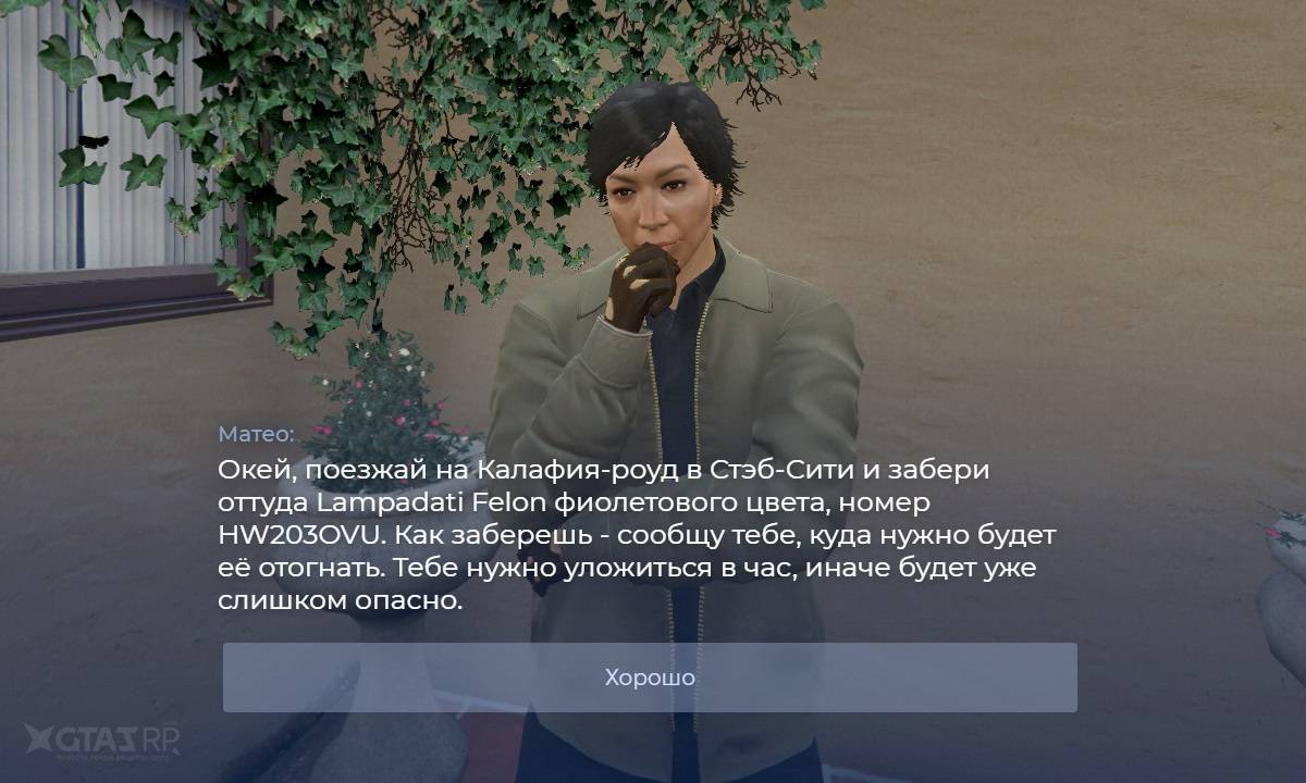 Поручение берется там же у бота на титуле фракции, взяв его, нам сообщат цвет авто, его марку, номер и примерное расположение.