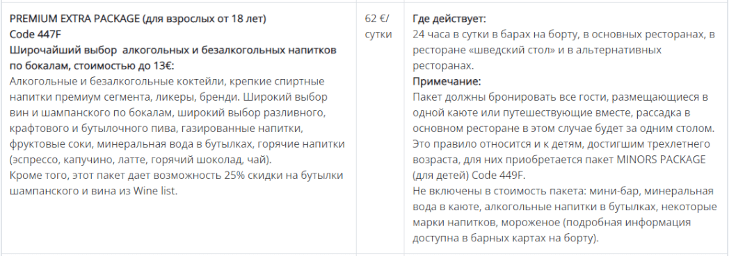 PREMIUM EXTRA PACKAGE. Так сказать, безлимитный алкогольный пакет. Стоит 62 евро за сутки. 62х7=434 евро.
