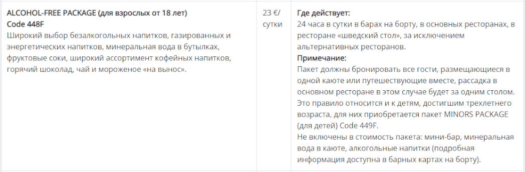Пакеты напитков бывают разные и вы сами выбираете какой именно вам подходит. Сразу оговорюсь, что при покупке пакета заранее вы не будете оплачивать дополнительно 15% за обслуживание, непосредственно на борту корабля выйдет дороже. Так же стоит отметить, что существуют акции, когда линия или туроператор при бронировании каюты выше внутренней дарит этот пакет. Нужно уточнять.
