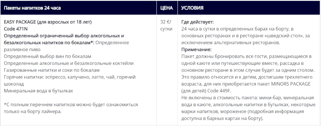 EASY PACKAGE. Самый простой и ограниченный пакет напитков. Стоимость за сутки как вы видите со скриншота официального сайта равна 32 евро.