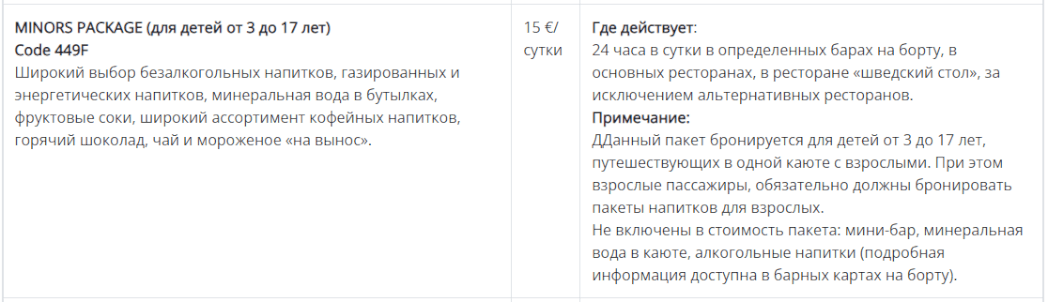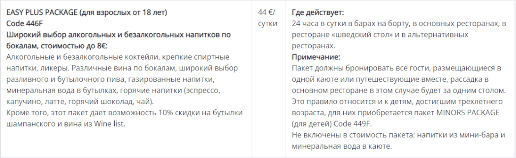 А теперь посчитаем почем выходит алкогольный пакет на семью из 3 человек. Например, был выбран средний пакет EASY PLUS PACKAGE и детский 308+308+119=735 евро. В дни распродаж и акций можно найти внутреннюю каюту обычного круиза за эти же деньги на семью из трех человек.