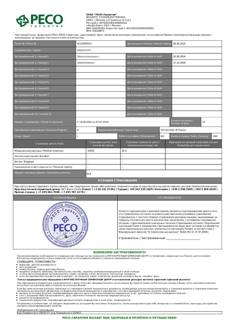 Асситанс: Образец полиса: Для организации медицинской помощи на территории стран Шенген Ингосстрах сотрудничает с ассистанской службой Balt Assistance Контакты ассистанской службы Balt Assistance в странах Шенген +7 (495) 137-50-20; +7 (401) 260-52-74+7 (909) 776-51-97claim@calltravel.eu | ||||||