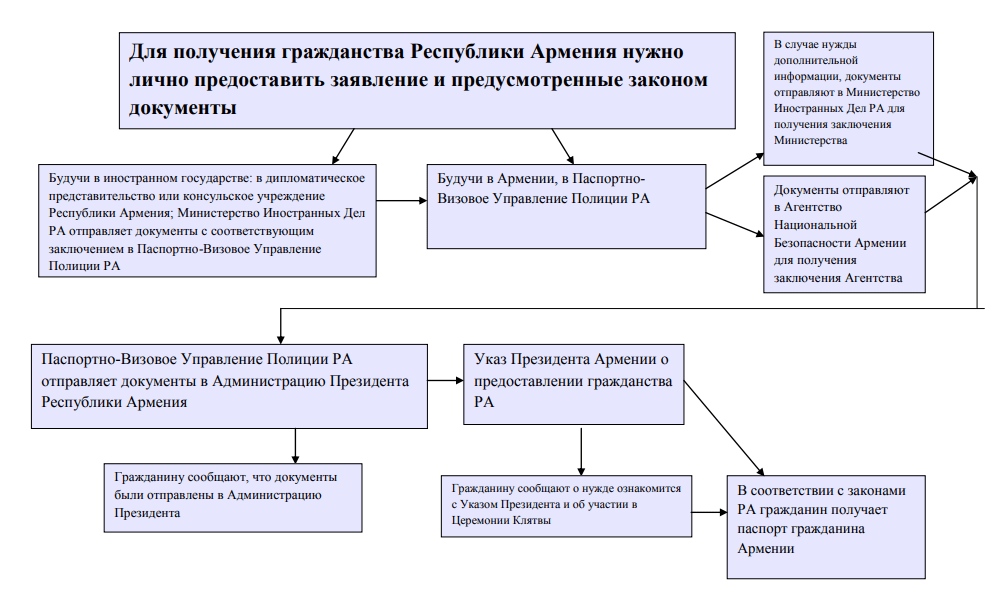 Порядок получения гражданства. Претендент подает заявку и заполняет анкету на армянском языке в консульстве, оплачивает пошлины и сдает экзамены.