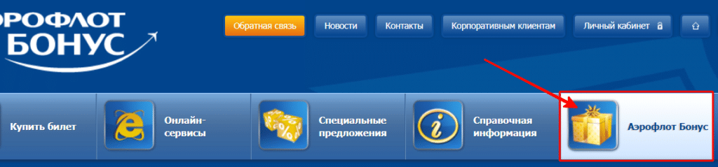 Заходим на сайт и в главном меню выбираем “Аэрофлот Бонус”.