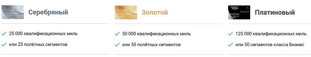 Бонусным предложением предусмотрено повышение статуса с использованием различных уровней и соответствующих им карт. При наборе нужного количества миль для пассажира будут выпущены серебряная, золотая и платиновая карты.