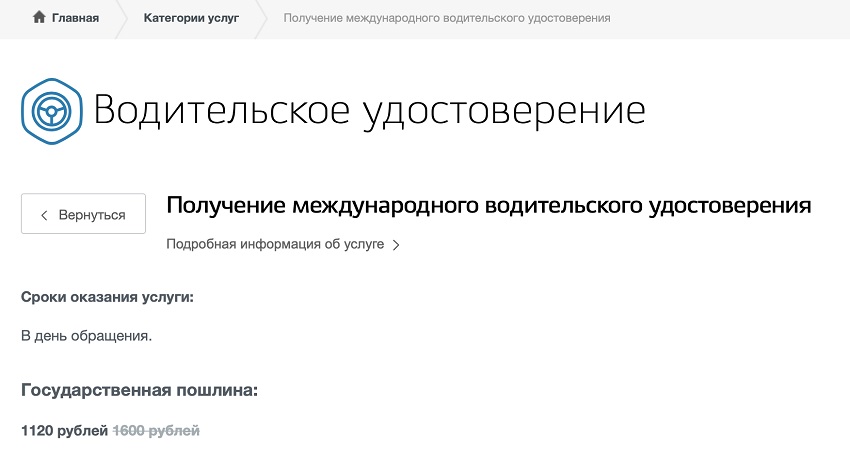 Сегодня получение международного водительского удостоверения через «Госуслуги» – это не только удобный, но и самый выгодный вариант. Дело в том, что с 1 января 2017 года при оформлении электронной заявки на получение государственных услуг доступна скидка 30% при уплате госпошлины. Так, за получение международных прав с учетом скидки требуется заплатить 1120 рублей. При выборе других способов оформления заявки придётся внести полную стоимость услуги.