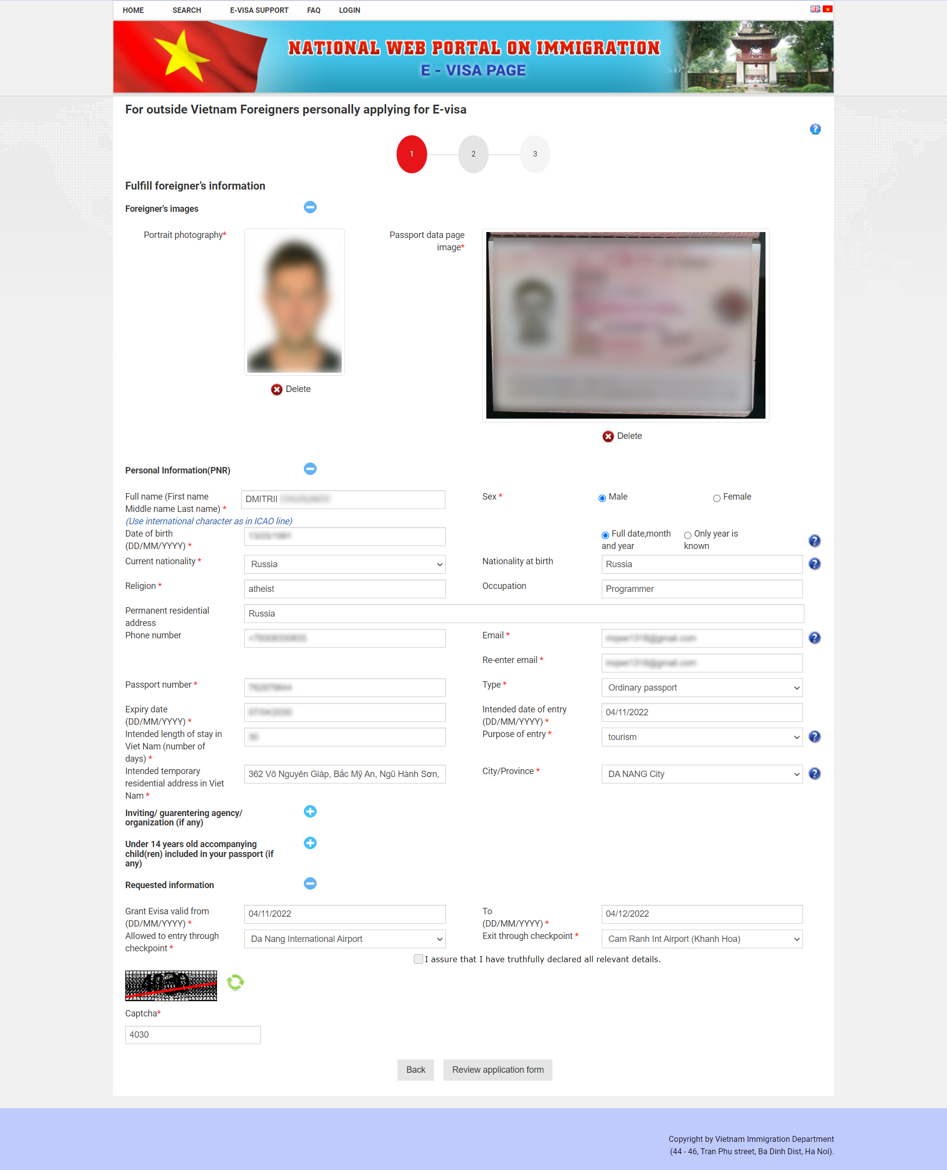- заявление-анкета в 2-х экземплярах, которую рекомендуется распечатать и заполнить заранее, но можно и непосредственно в аэропорту. Язык внесения данных: английский, французский или вьетнамский. Пункты опросника представляют собой вопросы общего характера о заявителе, сроки пребывания, а также информацию о предыдущих посещениях и планируемых прохождений соседних границ в указанные даты посещения Вьетнама;