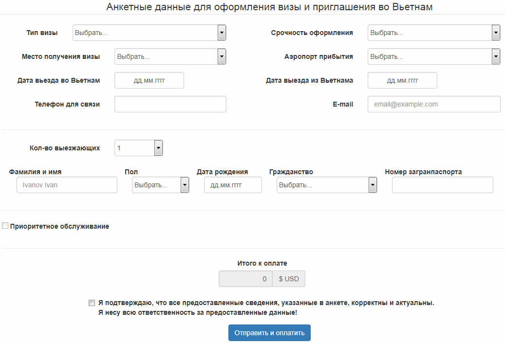 На сайте необходимо заполнить паспортные данные прибывающих во Вьетнам, даты прилёта, цель визита в страну. Далее нужно произвести оплату писем с помощью банковской карты. Также есть возможность оплатить через PayPal или Western Union, номы всегда платим картой — это самый быстрый и удобный способ.