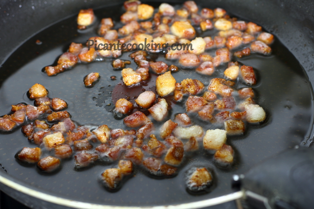 3) В сухой сковороде подрумянить бекон. Вытопить как можно больше жира.