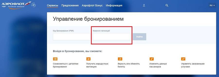 Откройте пункт для управления бронированием. В открывшуюся форму введите PNR-код (так еще называют код бронирования) и свою фамилию латиницей