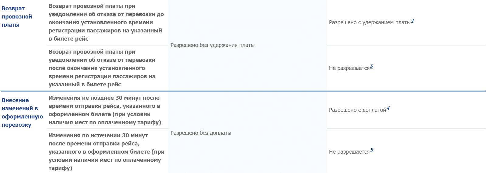 По правилам авиаперевозчика бесплатно обменять билет на другой рейс, изменить дату или время вылета могут пассажиры, путешествующие по тарифу Бизнес Премиум, включающий привилегированный спектр услуг. При возврате/обмене авиабилета компания не удерживает процент за различные сборы и не предъявляет к оплате штрафные санкции.