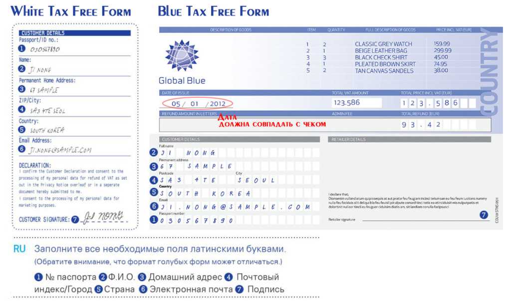 Перед приобретением товара следует попросить продавца оформить чек Такс Фри. Наличие карты Global Blue Tax Free дает возможность сразу расплачиваться за товар в магазинах, поддерживающих систему Global Blue, а персональные данные будут автоматически отображены в чеке, что позволяет экономить время и исключить вероятность допущения ошибки.
