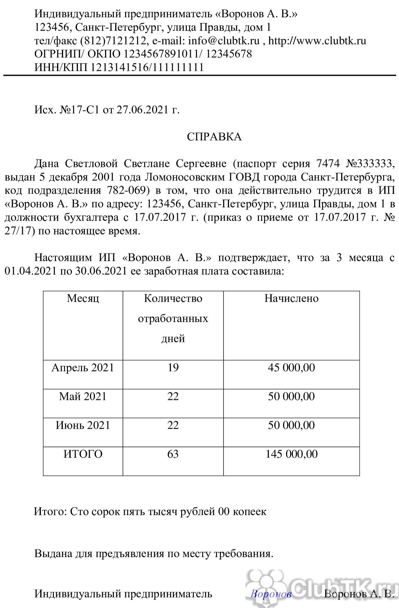 ИП «Воронов А.В.» 123456, Санкт-Петербург, улица Правды, дом 1 ОГРНИП/ОКПО 1234567891011/12345678 ИНН/КПП 1213141516/111111111 Исх. № 17-С1 от 27.06.2021 СПРАВКА Дана Сергееву Сергею Сергеевичу (паспорт серия 9777 № 777777, выдан 17 марта 2017 года Ломоносовским ГОВД города Санкт-Петербурга, код подразделения 782-069) в том, что он действительно трудится у ИП «Воронов А.В.» по адресу: 123456, Санкт-Петербург, улица Правды, дом 1, в должности системного администратора с 17.07.2017 (приказ о приеме от 17.07.2017 № 27/17) по настоящее время. Выдана для предъявления по месту требования.