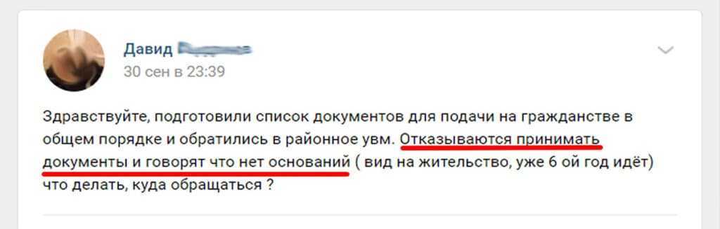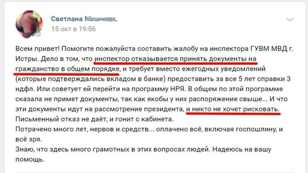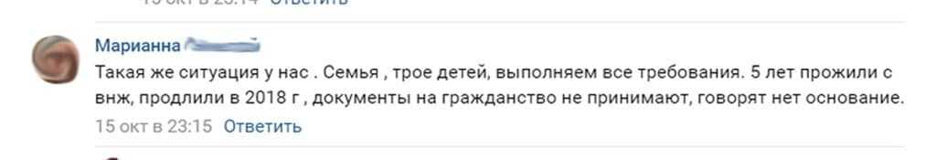 На форумах можно встретить немало негативных отзывов о подаче по такой схеме. У некоторых иностранных граждан инспекторы просто отказываются принимать заявление на гражданство в общем порядке, говоря, что «нет оснований» для оформления. Вот несколько примеров таких отзывов: