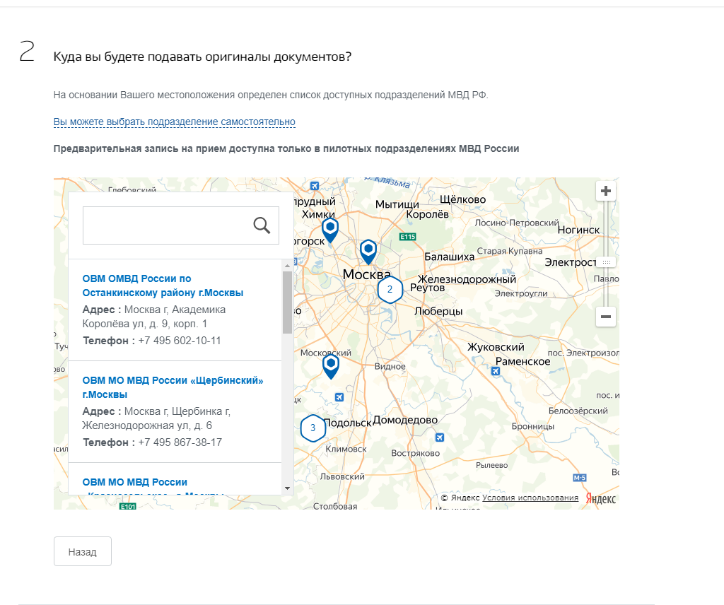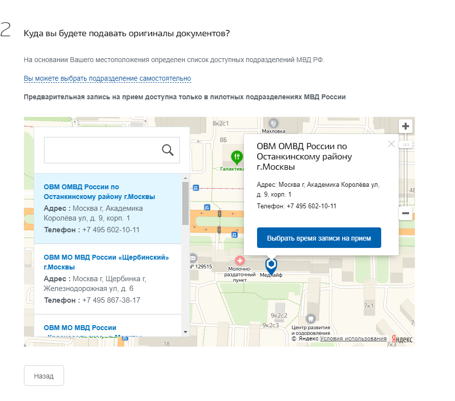 При заполнении заявления пользователь может выбрать любое подразделение МВД, но система автоматически предлагает выбрать ближайшее по месту прописки.