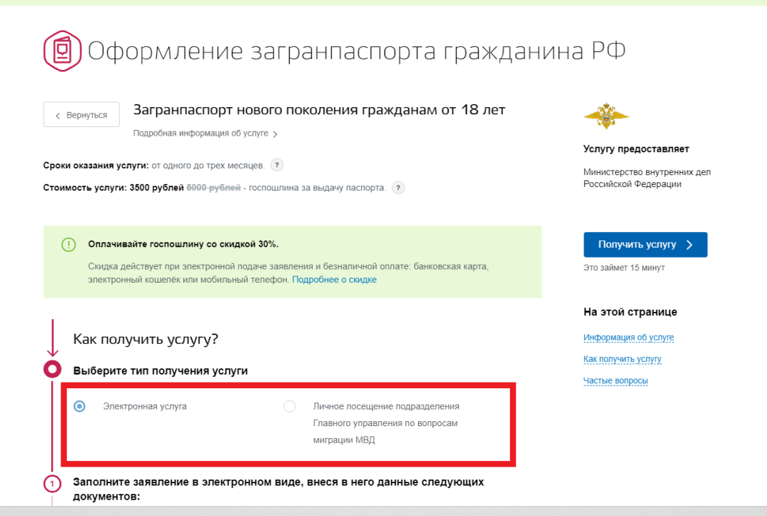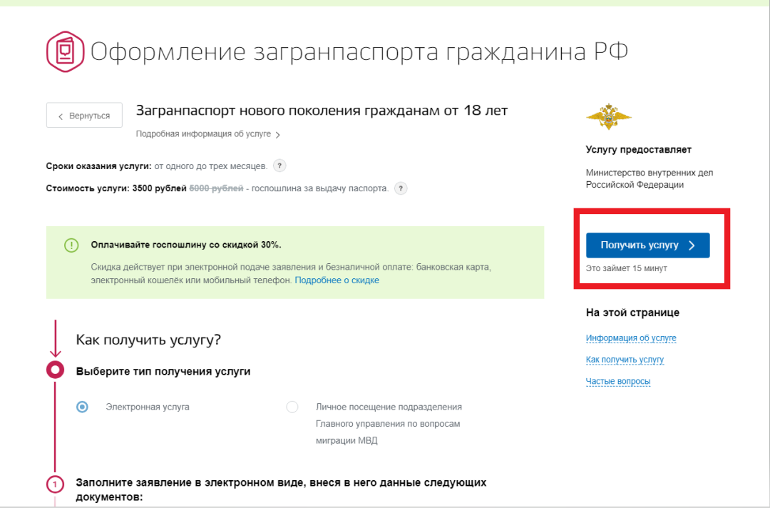 Как только подготовительные действия выполнены, сделан выбор в пользу одного из двух видов документов, можно приступать к составлению заявки. Для этого на следующей странице необходимо нажать кнопку «Получить услугу».