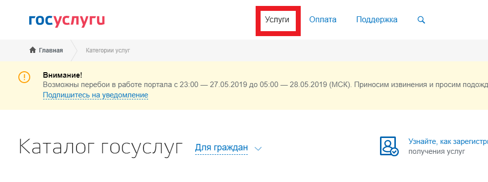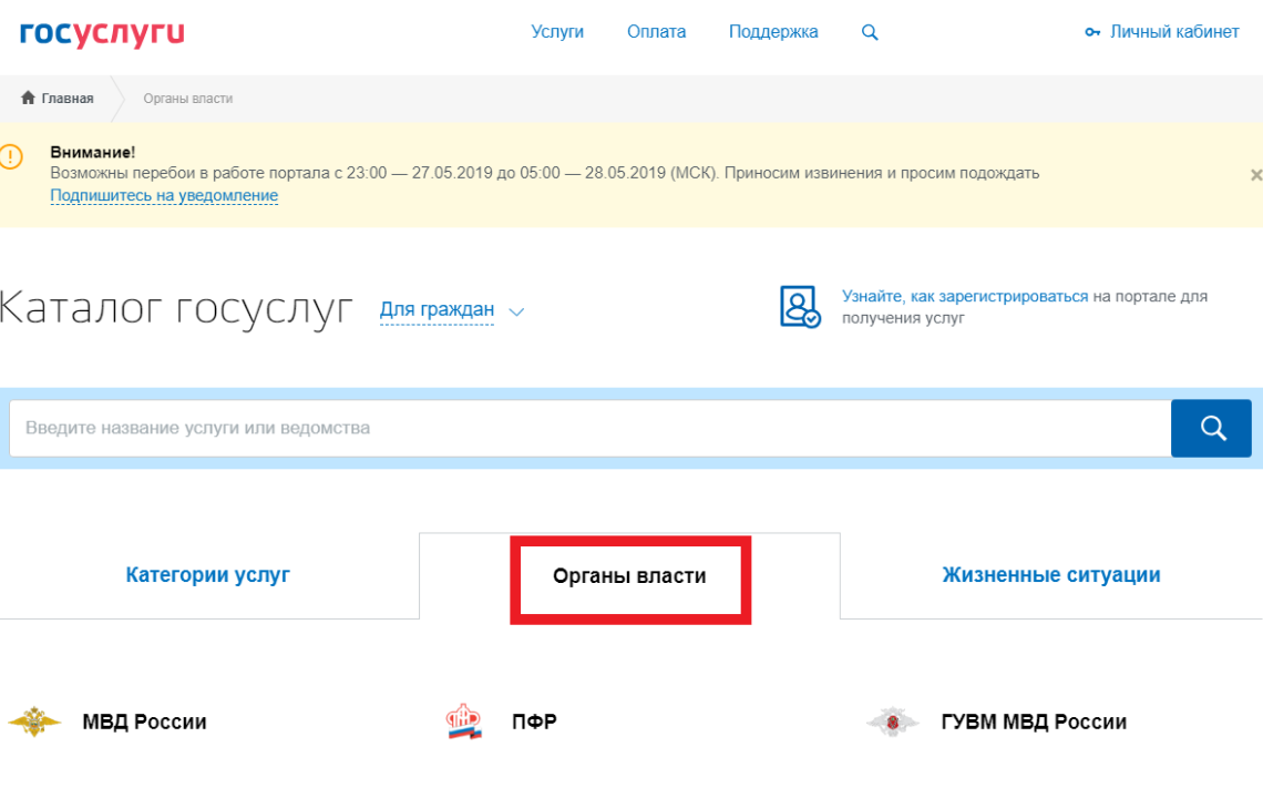 - Открыть раздел “Услуги” и либо подпункт “Паспорта, регистрации, визы” пункта “Категории”, либо “ГУВМ МВД России” пункта “Органы власти”;