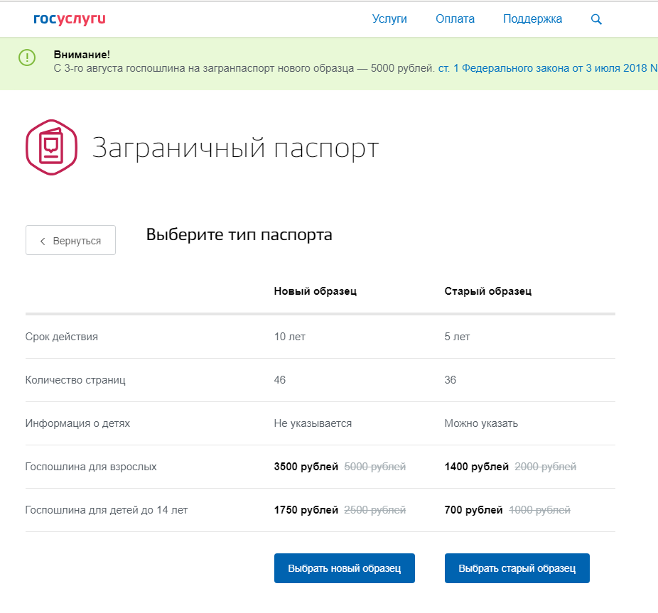 Если Вам нужен биометрический загранпаспорт, то следует нажать на кнопку «Выбрать новый образец», если паспорт старого типа — соответственно «Выбрать старый образец».