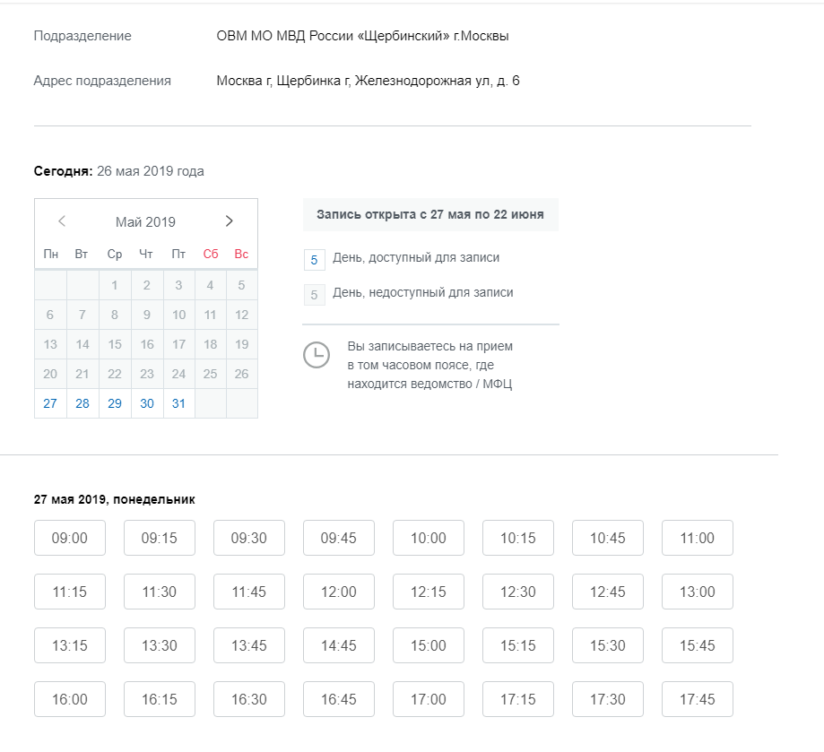 После этого откроется окно, где будут указаны дни, в которые возможна запись, а также указано время, которое доступно для записи.