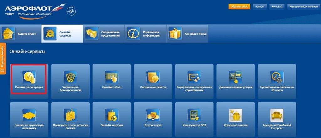 Для того чтобы зарегистрироваться онлайн на рейс Аэрофлота, необходимо перейти во вкладку сайта авиаперевозчика под названием «Онлайн-сервисы».