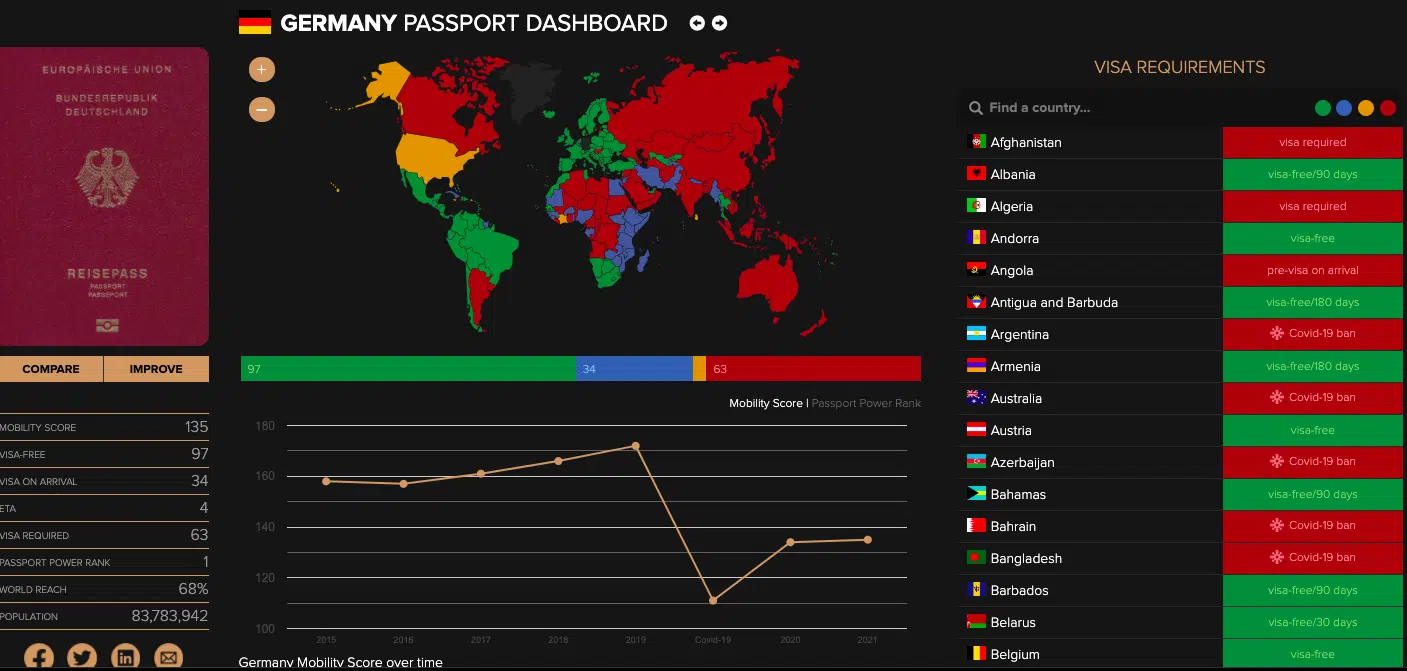 В связи с временными ограничениями из-за пандемии коронавируса с немецким загранпаспортом сейчас можно посетить 134 страны