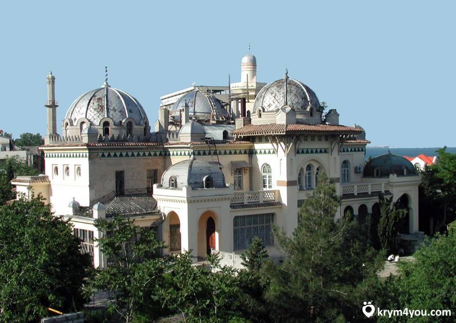 Здание было построено для семьи табачных фабрикантов. В результате пятилетней работы в Феодосии появился дворец в мавританском стиле с минаретами. На территории дачи есть мраморные фонтаны и зимний сад.