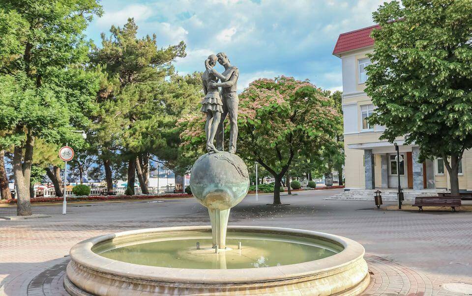 Скульптор запечатлел момент расставания. Юноша и девушка опечалены предстоящей разлукой, собираются поцеловаться. А у них под ногами целый земной шар. Автор композиции — Мигран Арутюнов. Фонтан установлен недалеко от Морвокзала: ведь именно отсюда юноша отплывал в дальние края. А недалеко находится ЗАГС города: после церемонии бракосочетания новые влюбленные сердца фотографируются у фонтана и клянутся в верности. Влюбленные сердца находятся на набережной между Макдоналдсом и Океанариумом.