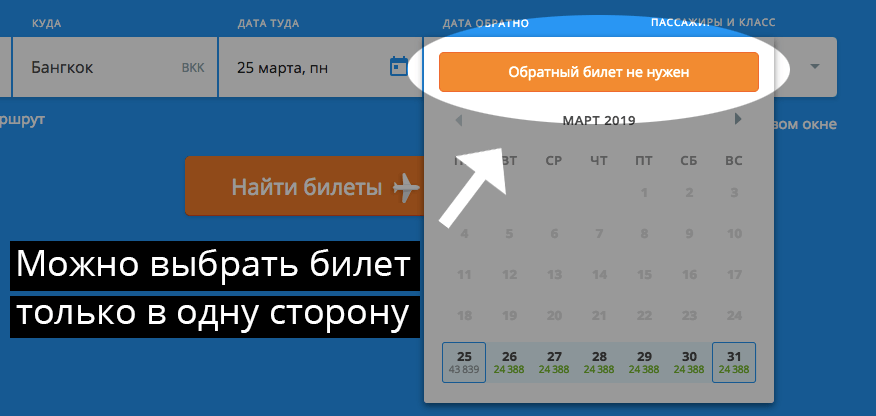 Если авиабилет нужен только в одну сторону, при выборе даты “обратно”, нажимаем “Обратный билет не нужен”.