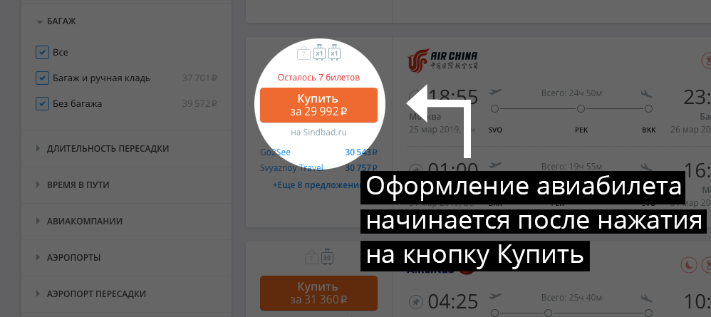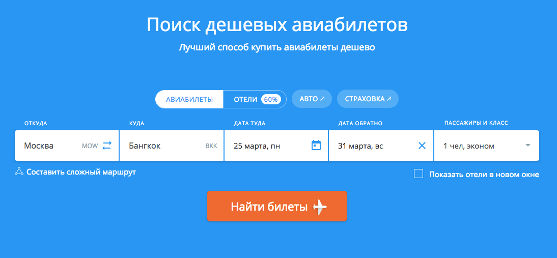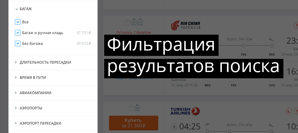 Рассмотрим на примере поиска авиабилетов по маршруту Москва – Бангокок в марте 2019 года.