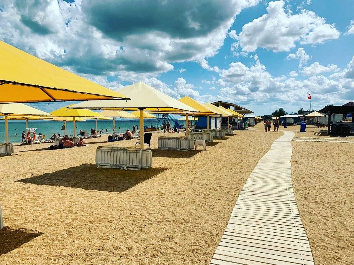 Инфраструктура пляжа позволяет приходить сюда как взрослым, так и ребятишкам. Шезлонги, зонтики, кабинки, пункт проката водного инвентаря, детские игровые площадки и спортивные развлечения для взрослых – тут не придется скучать. В шаговой доступности кафе, рестораны. Ширина пляжа порядка 100 м, длина 3 км – даже при большом скоплении народа тут не придется толкаться локтями.