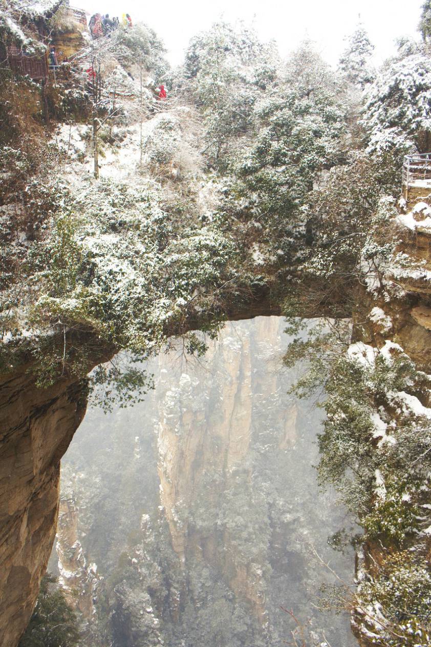 Из района Янгцзяцзе, от верхней канатной станции, необходимо сесть на автобус до туристического центра парка Юаньцзяцзе. Пейзажи этого парка чаще всего и сравнивают с горами из известного фильма. В этом месте находится самая известная 1080-метровая гора Аватар Аллилуйя, которую также называют «Одиноко стоящий каменный столб, поддерживающий небо» или «Столб в южном небе». Название, связанное с аватаром, гора получила после выхода культового фильма. Здесь же можно увидеть и самый высокий Природный мост в мире (Мост через Небо) – уникальное природное творение, соединяющее пики двух скал. Его длина составляет 50 метров. Китайский мост легко узнать по красным лентам с пожеланиями и замочками влюбленных. На эти края будет достаточно 1,5-2 часа.