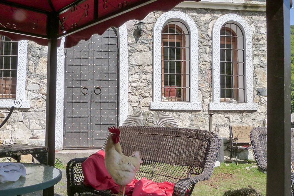 Мы заметили на заднем дворе местного петуха, который отдыхал в теньке на садовой мебели