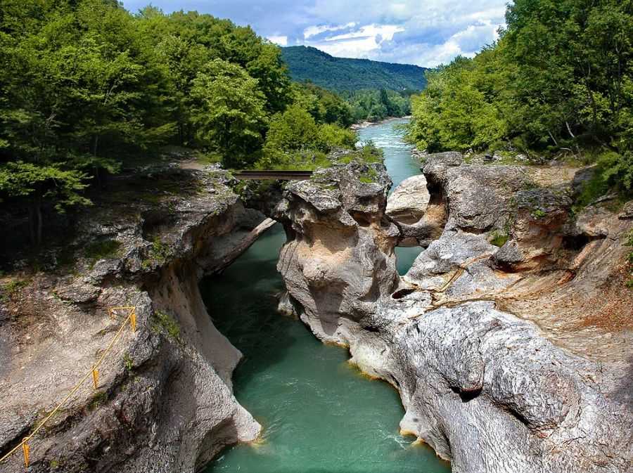 За появление на карте Адыгеи этого зеленого ущелья нужно благодарить реку Курджипс, тысячелетиями точившую крепкие скалы. Вода вымыла горный хребет, создав каньон, уходящий вниз на 400 метров, обеспечив себе причудливое русло. В трудных местах вода прорывается и падает вниз живописными водопадами, превращающимися в ледяную сказку с наступлением холодов. Летом ущелье утопает в буйной зелени многочисленных деревьев, радуя туристов прохладой даже в самый разгар жарких дней, осенью же воды реки прячутся под золотом крон. Осмотреть красоты ущелья можно прогулявшись по пешеходному маршруту или прокатившись в экскурсионном вагончике.