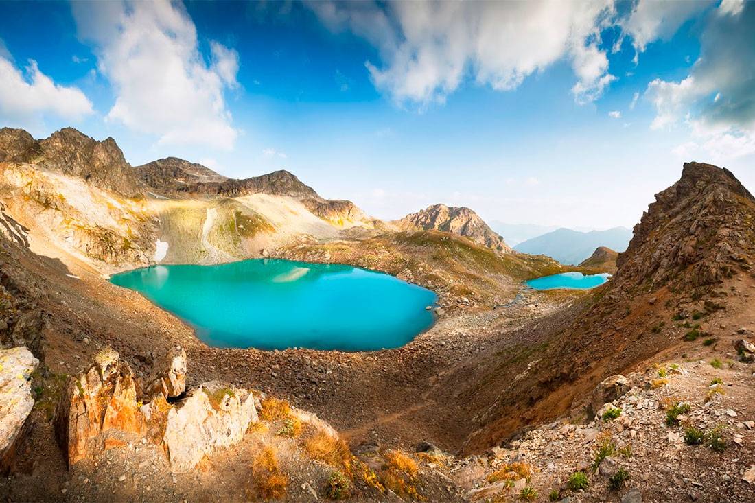 Карачаево-Черкесия, достопримечательности которой ежегодно посещают более 1 млн туристов, предлагает познакомиться с самым красивым местом в Домбае. Озера представляют собой комплекс из 3 горных водоемов, расположенных на разном уровне. Температура воды в них даже в летнее время не превышает +5°С.