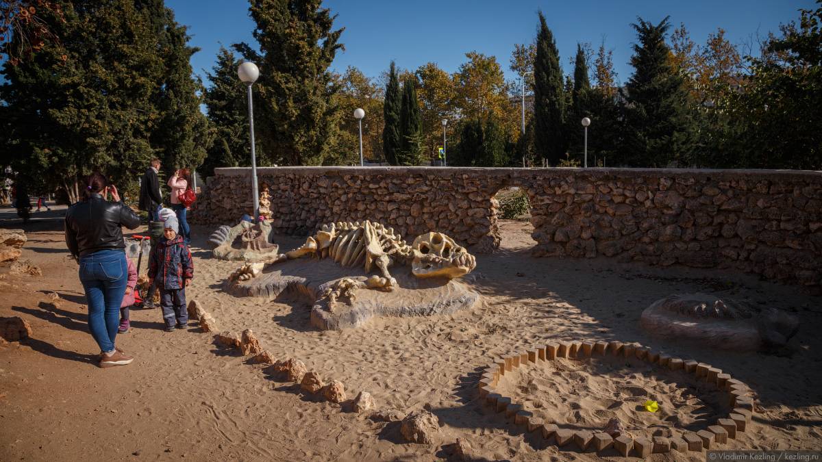 Одно из интереснейших мест сквера — песочница, имитирующая зону палеонтологических раскопок. Эх, в моём детстве во дворе были лишь деревянная горка да металлическая лазалка с видом на кирпичные гаражи, использовавшиеся спешащими с работы мужиками в качестве писсуара.