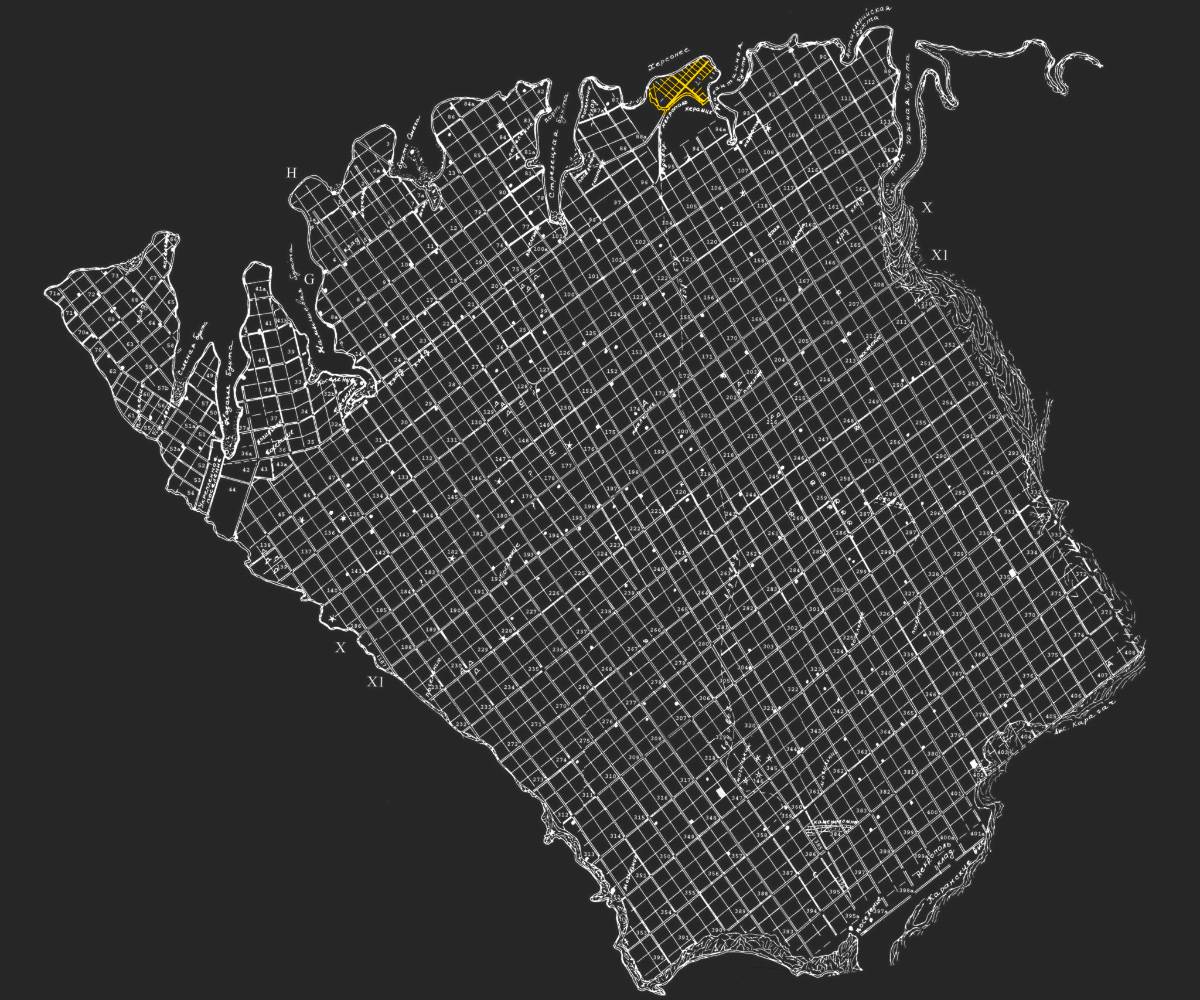 Чтобы вы понимали масштаб — посмотрите на следующую карту. Территория города (читай: современного музея-заповедника) отмечена жёлтым, всё остальное — хора, нарезанная перпендикулярами древних дорог.