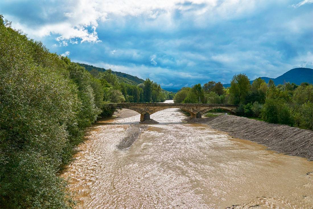 То есть это – самый настоящий памятник истории. Верх ничем не украшен, а вот опорная (нижняя) часть – это целых три полукруглые арки. Сейчас уже мало кто умеет делать арочные своды. Раньше они были повсюду. Остается добавить: какое-то время в году переход попросту не нужен. Речка существенно мелеет…
