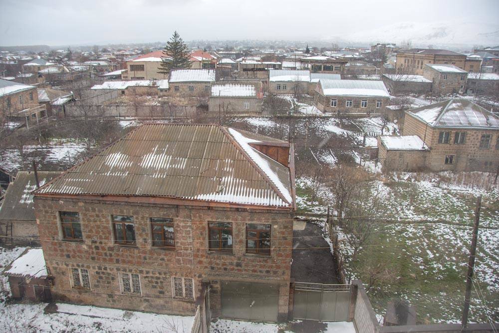 В рамках истории про перевал хочу рассказать про то, как почти занесенные снегом, мы все-таки добрались до Мартуни, населенного пункта недалеко от берега Севана, еще до темноты. Добрались, чтобы обнаружить, что остановиться в Мартуне негде: комнат никто не сдает. Но! На главной улице грозно высился реликт советской эпохи, гостиница Алашкерт. Это вид из окна.