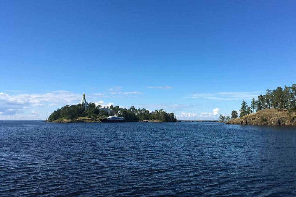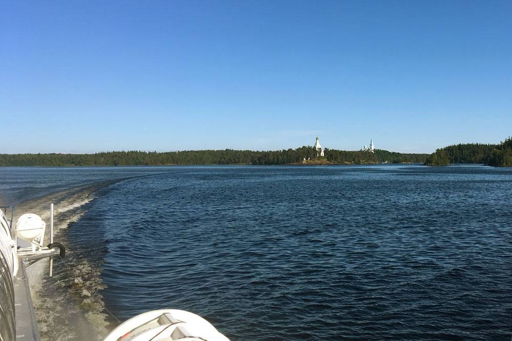 С борта «Метеора» при входе в бухту виден Никольский скит на Никольском острове. Он будет слева по борту. У нас не получилось туда попасть в режиме «успеть все за пять часов». Пешком от причала до Никольского острова можно дойти за 25 минут, доехать на велосипеде — за 8 минут.
