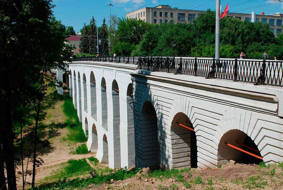 Обязательно нужно посетить указанное сооружение в Калуге. Мост длиной 160 метров протянулся между сторонами Березуйского оврага. Построен объект в 1785 г. при содействии губернатора М. Кречетникова, является древнейшим каменным виадуком России. Конфигурация менялась несколько раз (чугунная ограда появилась в 40-х годах позапрошлого века, полотно из дерева заменили на ж/б в 1910 г.).