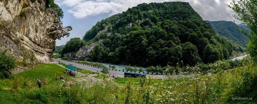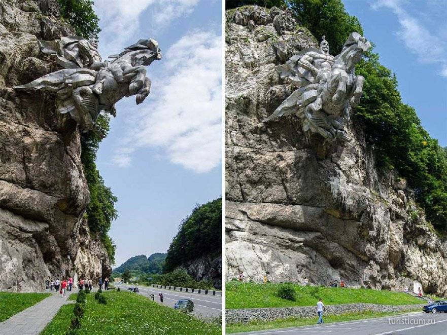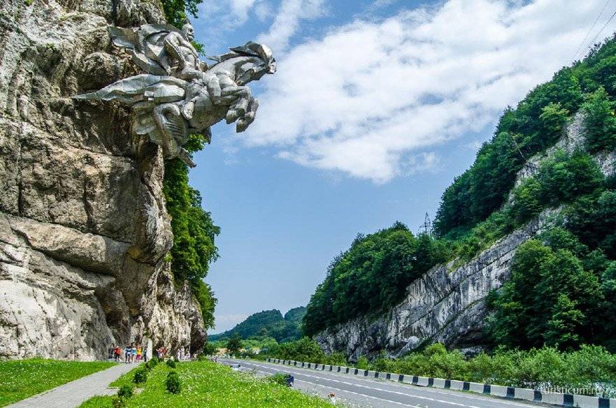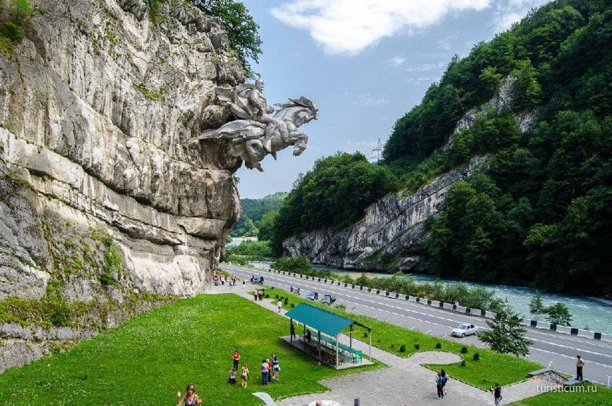 Дорога в Цейское ущелье проходит через транскавказскую магистраль — транскам, и у самого начала Алагирского ущелья мы останавливаемся. Здесь расположен массивный памятник Уастырджи. В осетинской мифологии Уастырджи — это главное божество, покровитель воинов и мужчин, под влиянием христианства, он трансформировался в образ святого Георгия, а дигорский диалект преобразовал имя персонажа из Уастырджи в Уасгерги — Святой (Уас) Георгий (Герги). 28 тонн металла, вмонтировано в скальную породу над транскамом, вдоль которого бежит горная река Ардон и сильно пахнет сероводородом, от находящихся неподалеку минеральных озер. Для любителей ЗОЖа, на этих озерах специально оборудованы турбазы, лечись себе на здоровье.