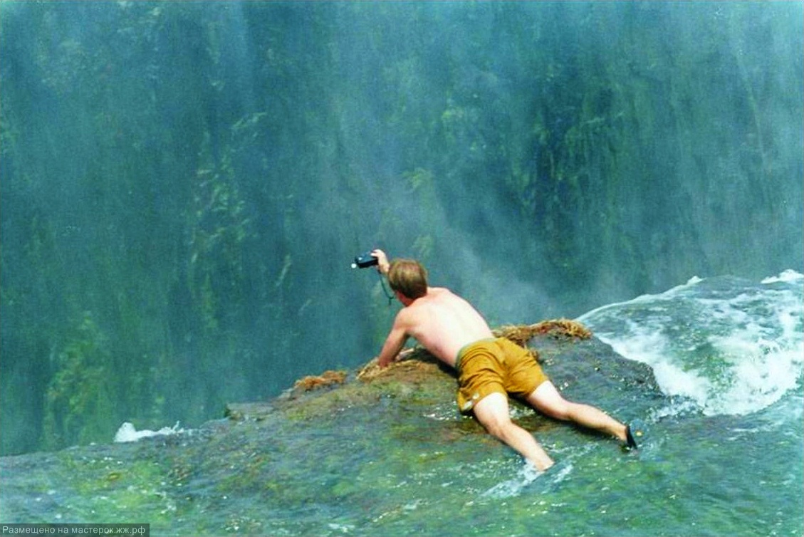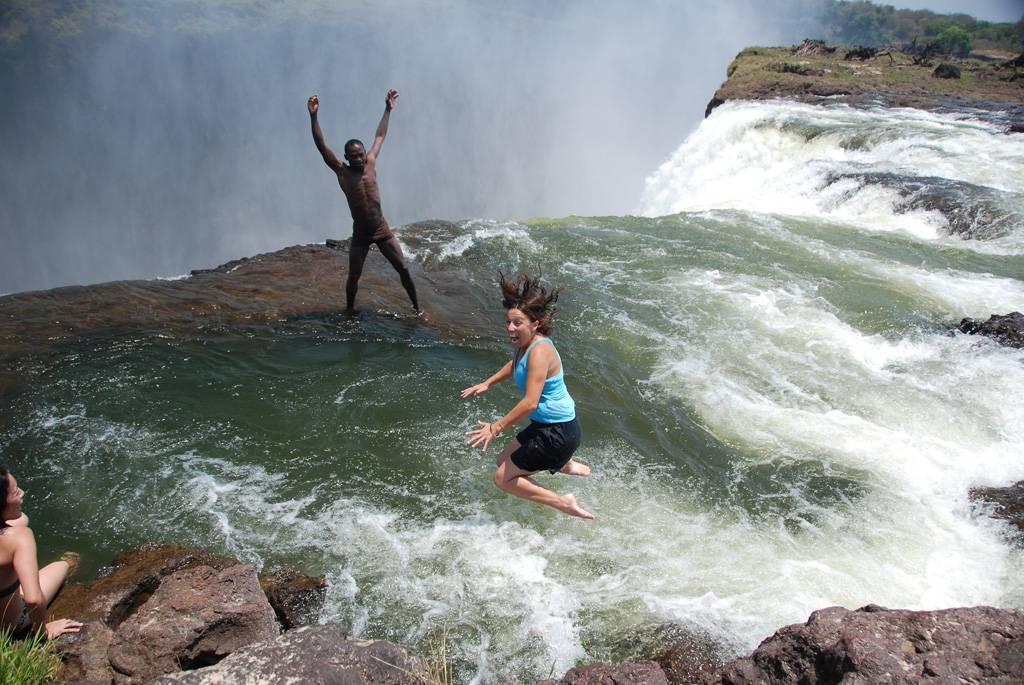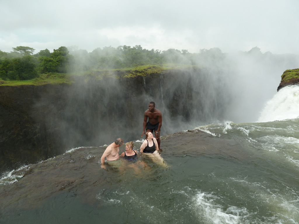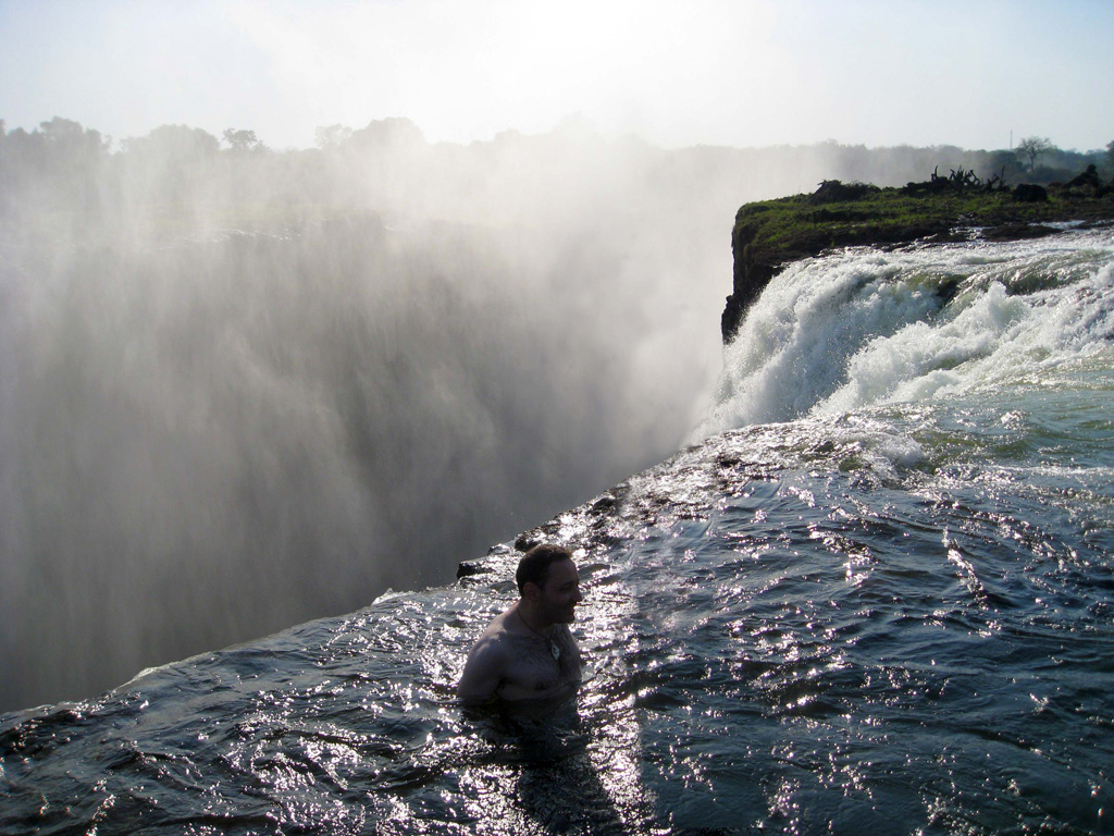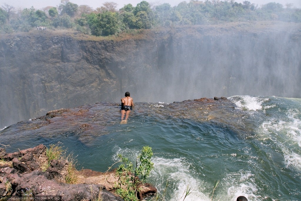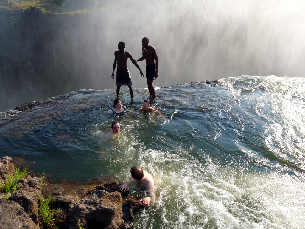 На самом гребне водопада на границе с Зимбабве есть тихая заводь: естественное углубление с ослабленным течением, образованное узкой гористой перемычкой, под названием Купель Дьявола.