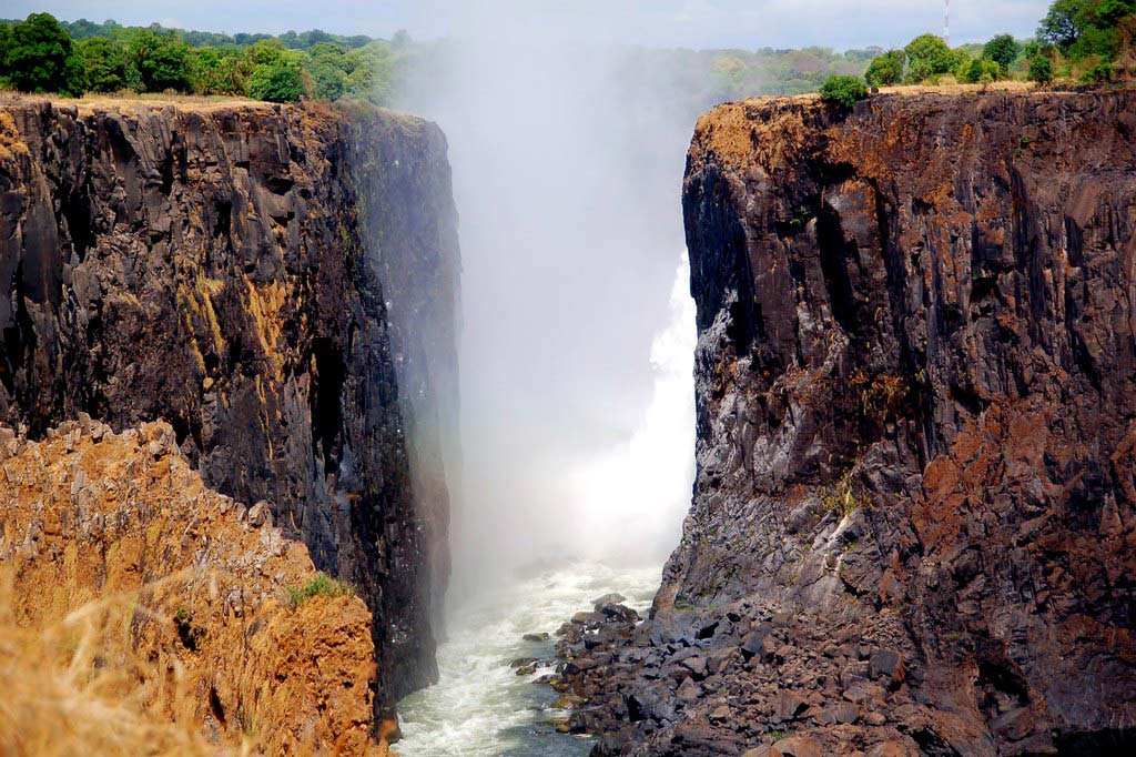 Но базальтовая плита заканчивается и в месте ее окончания сформировался узкий каньон. Его ширина всего 120 метров. Но эти 120 метров расколотой земной коры превращают тихое и спокойное течение реки в громкое и бурлящее место. Со времен появления водопада Виктории немало воды утекло и эта вода, как нож в масле, вырезала для себя в скале множество протоков, разделив общее русло на множество протоков, «проложенных» островками. Расщелины в скалах, которые создала вода, настолько велики, что их видно на фотографиях из космоса.