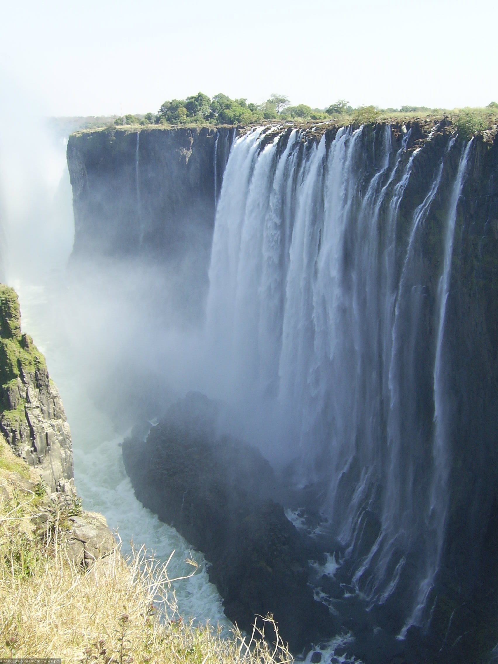 Низвергающийся, гудящий поток воды, летящий с высоты вдвое выше Ниагарского водопада, километр в длинну, пропускающий через свое жерло 750 миллинов литров в минуту — все это Водопад Виктория (Victoria Falls) в Зимбабве. Он создает такой туман из брызг, что местные жители называют его «Дым, который гремит». Глубокой древностью у самого обрыва собирались шаманы и колдуны, где они совершали магические обряды и жертвоприношения.