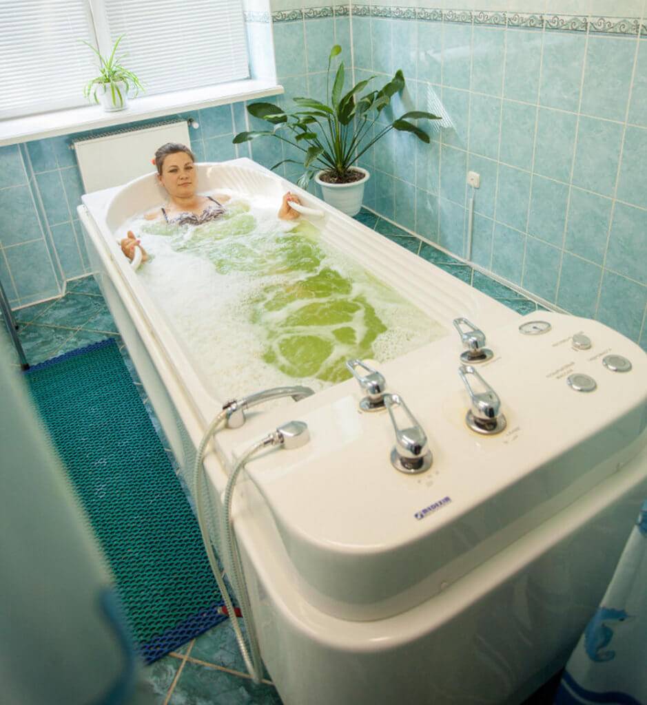 Бальнеотерапия — применение сероводородных, радоновых и кислородно-озоновых ванн. При этом больной погружается в минеральную воду с определенной температурой, которая благотворно воздействует на кожные рецепторы, а также слизистые оболочки легких, делая дыхание глубоким и ровным.