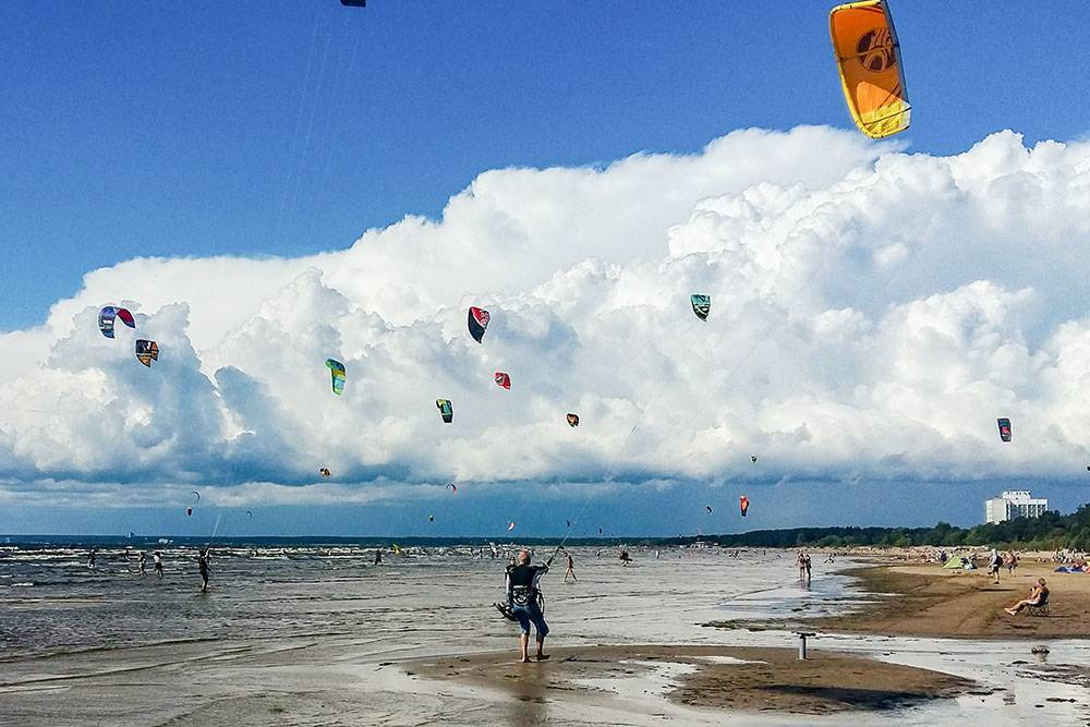 Кайтеры на берегу залива. Им там удобно: сильный ветер, длинный пляж, а глубина небольшая — все недостатки Финского залива для кайтеров становятся преимуществами